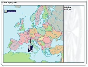 A pergunta é “onde fica” e para responder você deve lançar o dardo na direção da localidade. O sistema calcula a distância do dardo para o ponto correto, é uma lição e uma brincadeira.