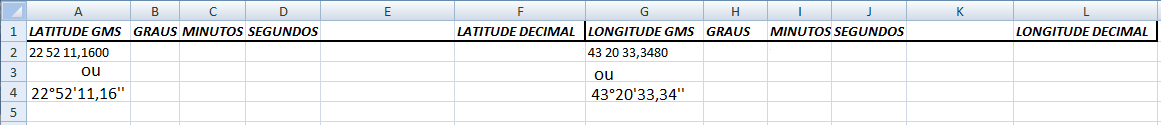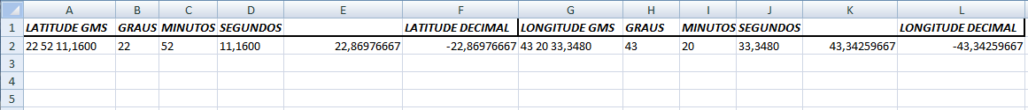 Neste momento, utilizaremos a fórmula tradicional de conversão : GRAUS+((MINUTOS/60)+(SEGUNDOS/3600)), que no excel corresponderá à cédula na qual a informação está hospedada, por exemplo =B2+((C2/60)+(D2/3600)).