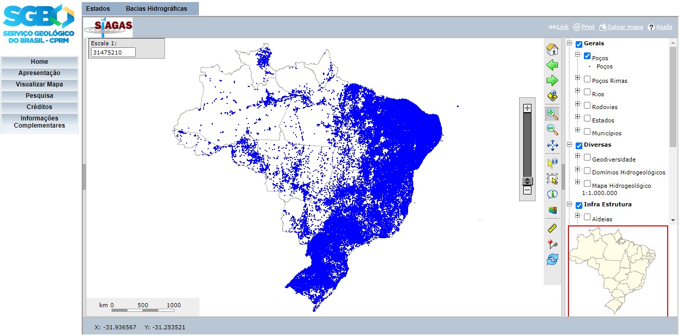 O Sistema de Informações de Águas Subterrâneas é o SIAGAS. Ele é desenvolvido pelo Serviço Geológico do Brasil – SGB e é constituído por uma base de dados de poços permanentemente atualizada. O SIAGAS permite a realização de consultas, pesquisas e extração e geração de relatórios.