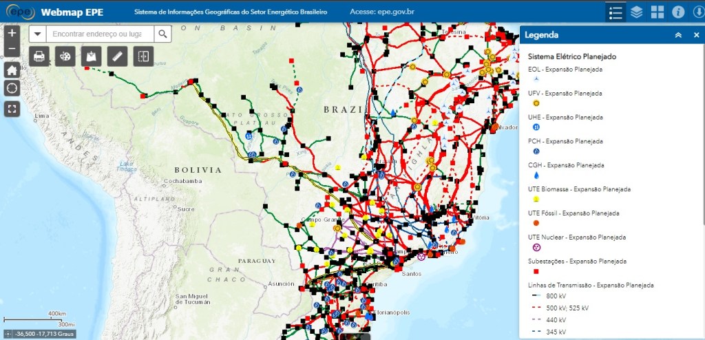 A Empresa de Pesquisa Energética disponibiliza um WEBMAP interativo do sistema elétrico brasileiro que permite realizar consultas, download em formatos vetorial e raster, medições de áreas e distâncias e adicionar seus próprios dados. O usuário pode ainda imprimir mapas a partir da base de dados georreferenciados que são utilizados nos estudos de planejamento do setor energético nacional, bem como fazer o cruzamento de informações com dados disponíveis, tais como áreas protegidas, projetos de assentamento e outros projetos da EPE.