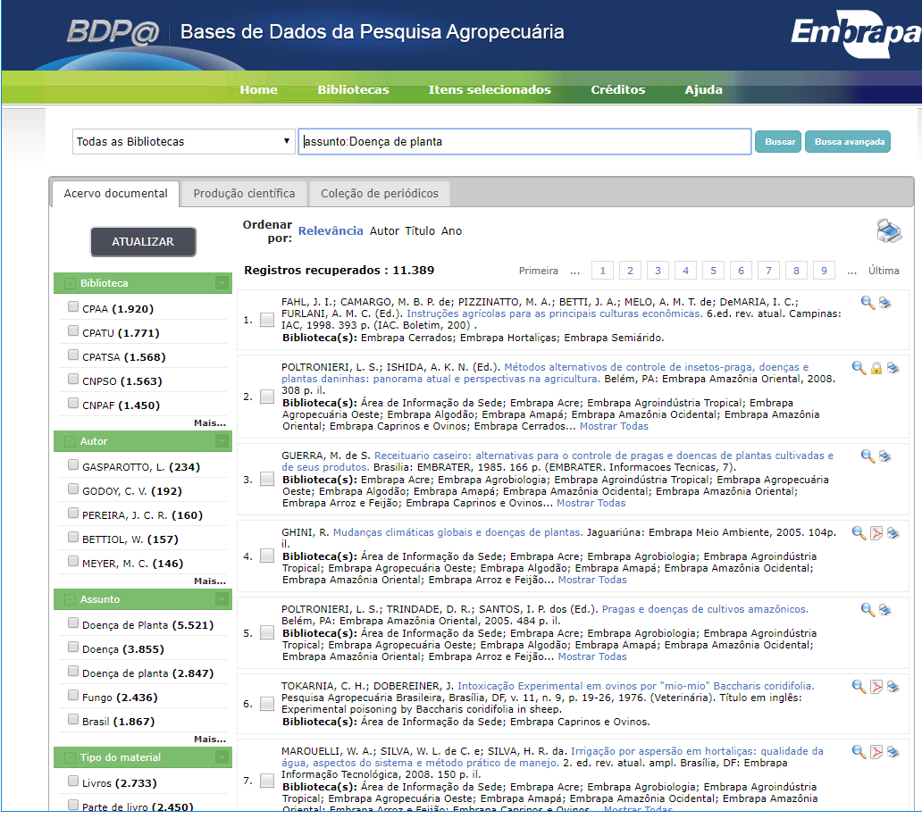A EMBRAPA está disponibilizando a consulta a quase 1 milhão de documentos indexados em 50 coleções. O banco permite encontrar o registro em qualquer uma das bibliotecas cadastradas, bem como fazer o download daqueles cuja cópia digital é autorizada.